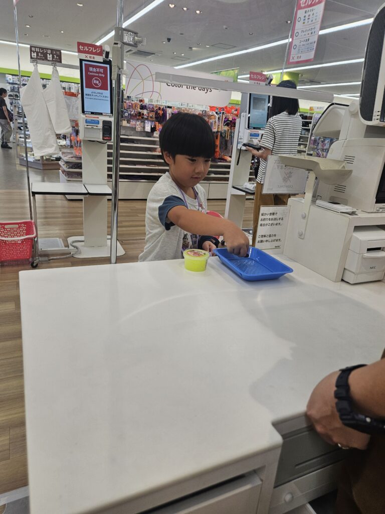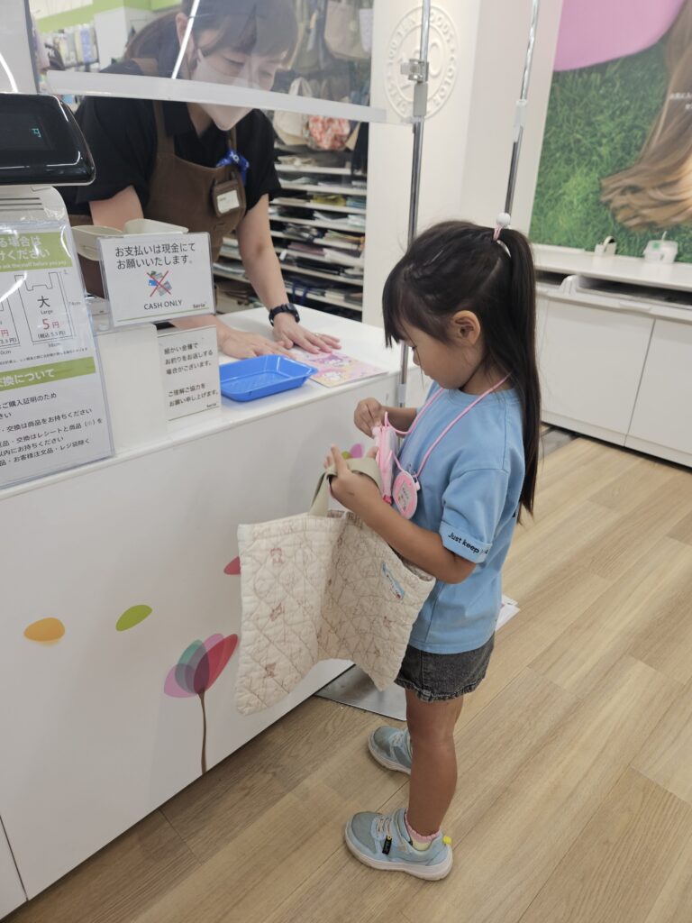お友達と一緒に「これにする?」「何買おうかな?」と相談しながら楽しそうに選んでいましたよ。買うものが決まると、早速レジでお会計!自分のお財布からお金を出して、店員さんに「ありがとうございます」と、お礼を言って自信満々な表情でお買い物が出来ました🌟