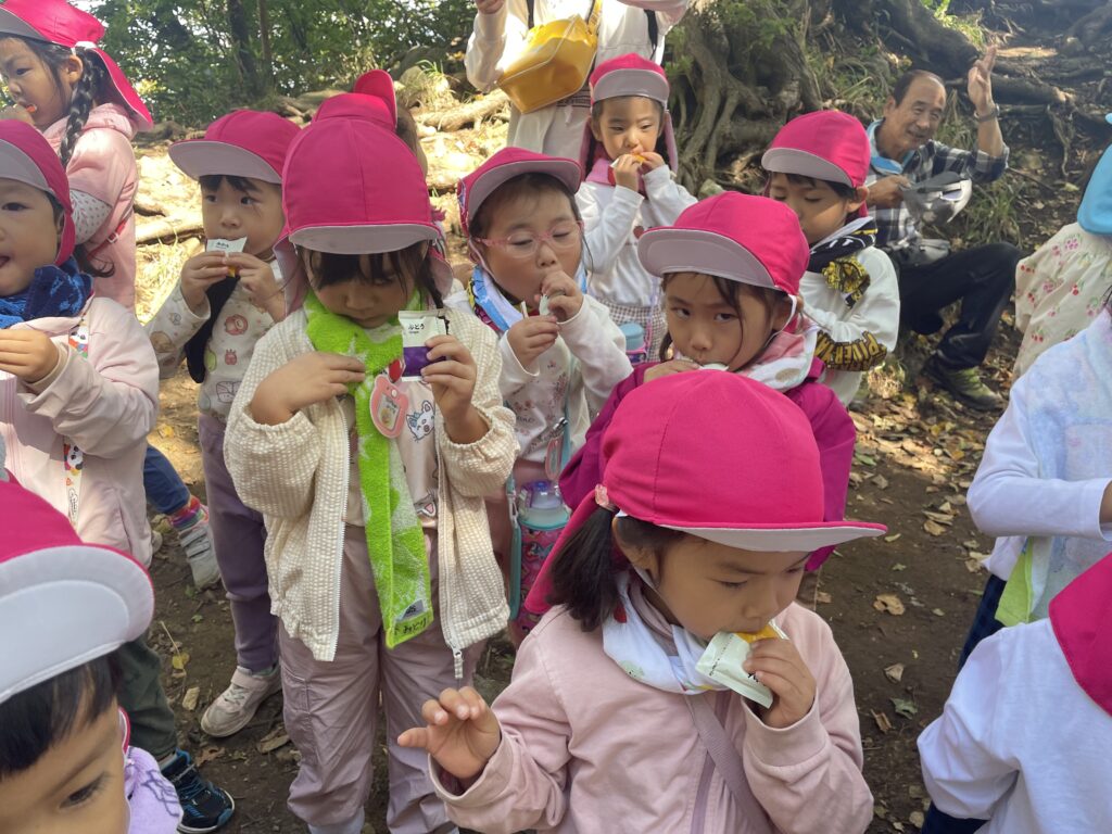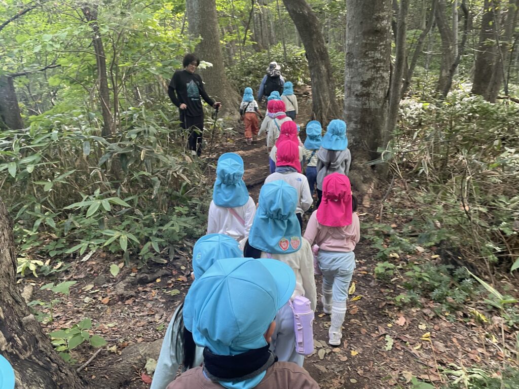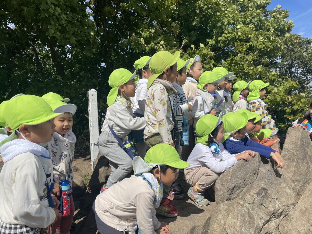 頂上目指して頑張るぞ!とみんなで気合いをいれていざ出発しました。険しい山道を一歩一歩踏みしめながら、それぞれのペースで登っていきました。途中でリスを見かけたり、行き交う人達にも元気に「こんにちは!」と挨拶をしたりと登山のマナーもバッチリでした。