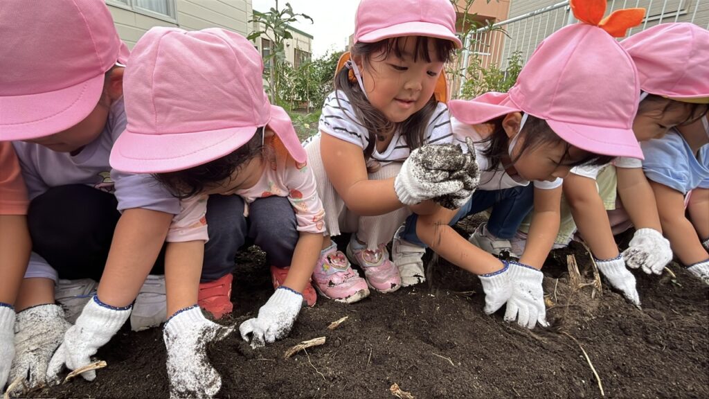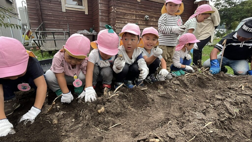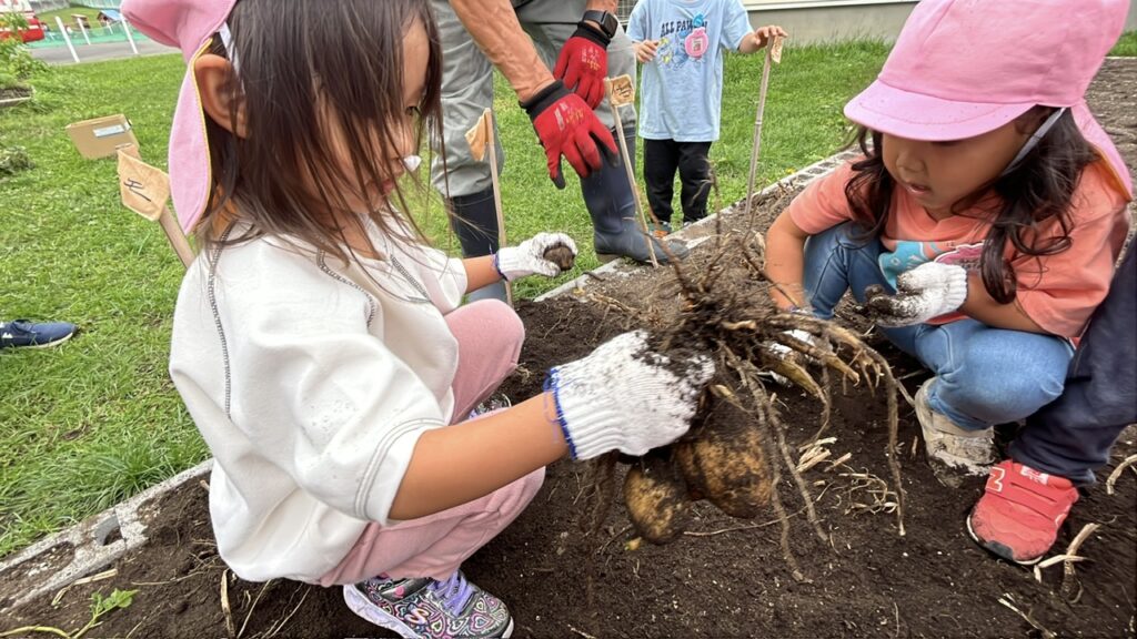 春にじゃがいもの種芋を植え、じゃがいもの成長を日々(春・夏・秋)観察してきました。緑の葉が大きくなり、花が咲いて、花や葉が枯れるとじゃがいもが土の中で大きくなっていることを学んでいた子どもたちは、今か今かと収穫を楽しみにしていました。