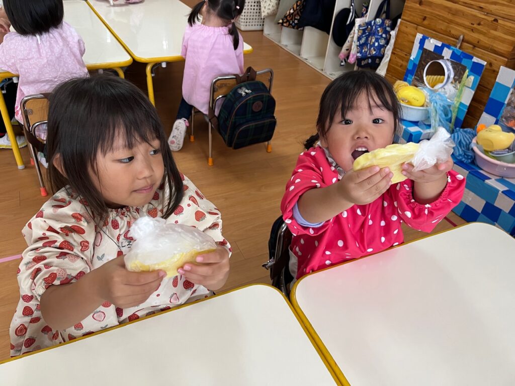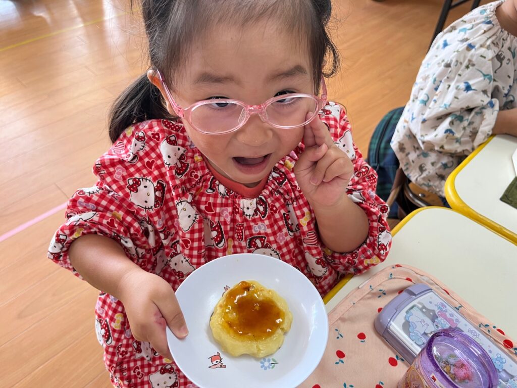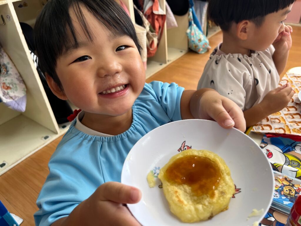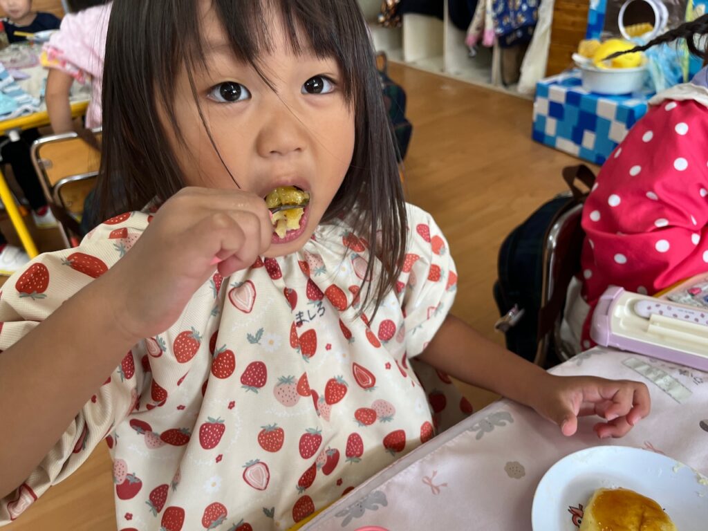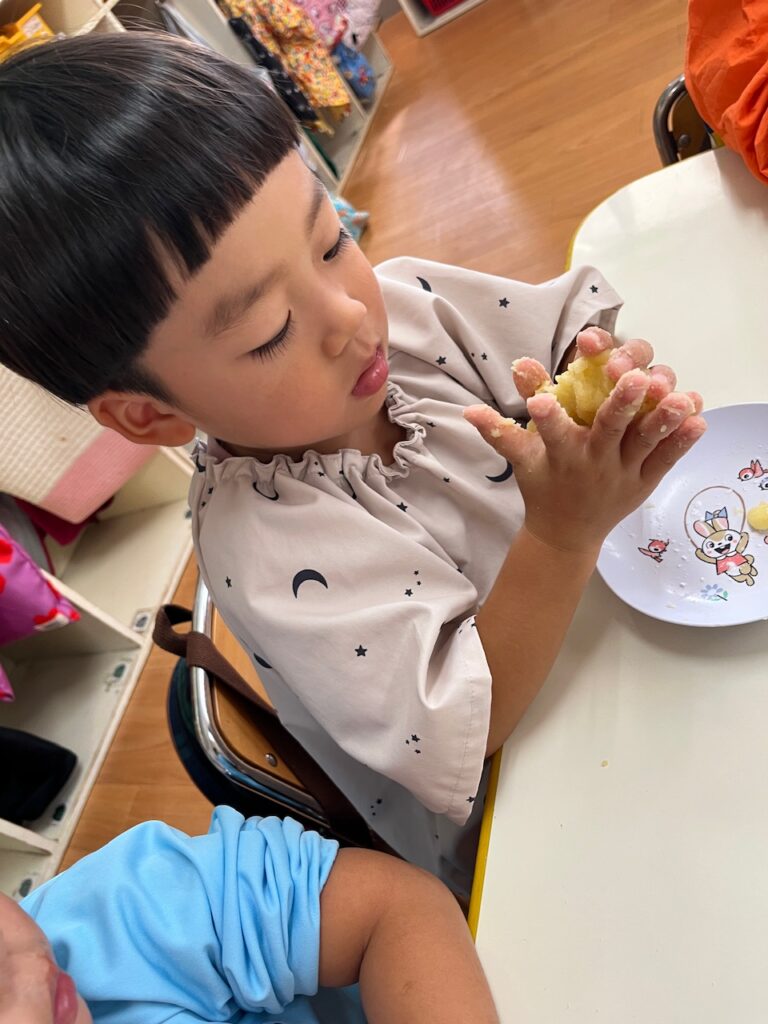 じゃがいもの甘さとたれの甘さが子どもたちのお口にあい♡『サイコー!』と話しながら、ペロリを食べ終えました。自分たちで育てた野菜を秋に収穫し、美味しいいももちにして全員で食べれたことが食育へとつながり、思い出に残る1日となりました。
