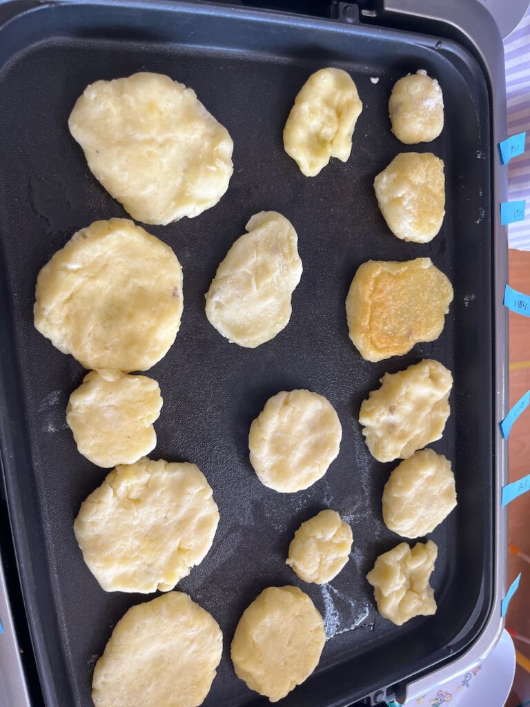 今回はそのじゃがいもを使って、クッキングをしました。今回は子どもたちの好きな【いももち】を作ることにしました。ほくほくになったジャガイモをつぶし、その後、片栗粉や塩を加えて、自分で好きな形を作りました。おもったより、練ったじゃがいもが手に付き戸惑いを見せる場面もありましたが、『自分で作る』ということを楽しんでいました。