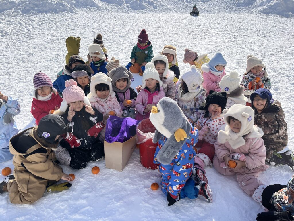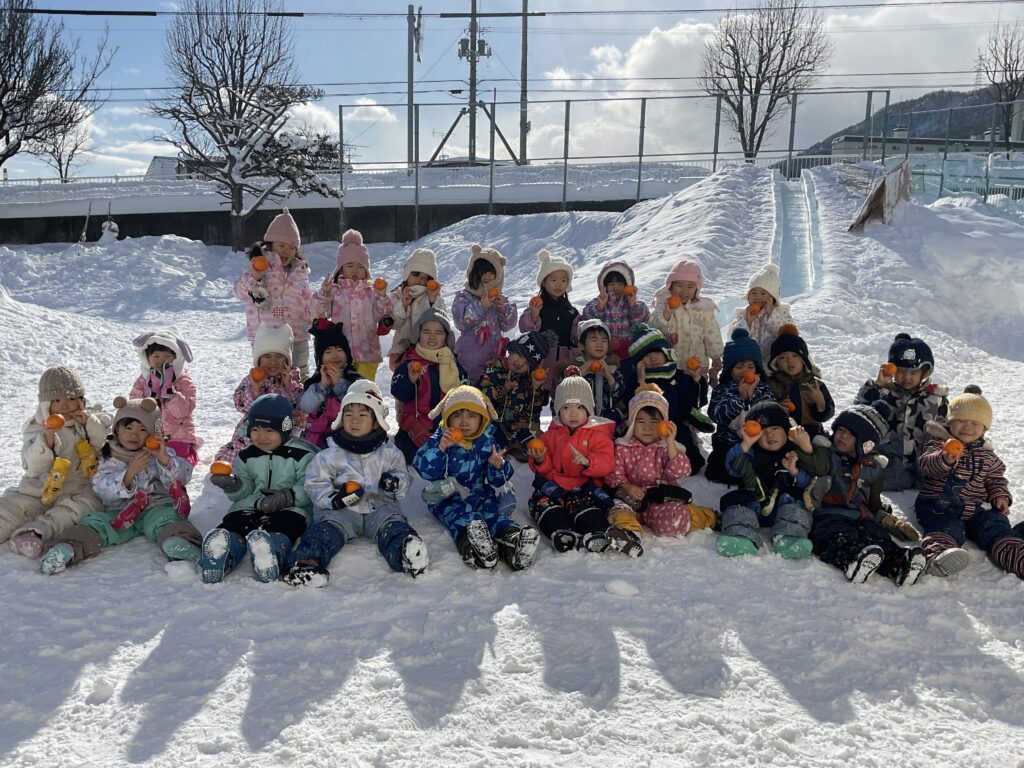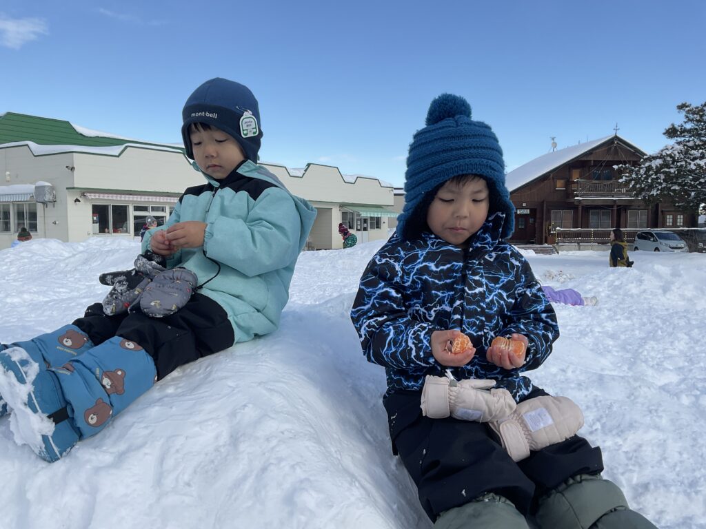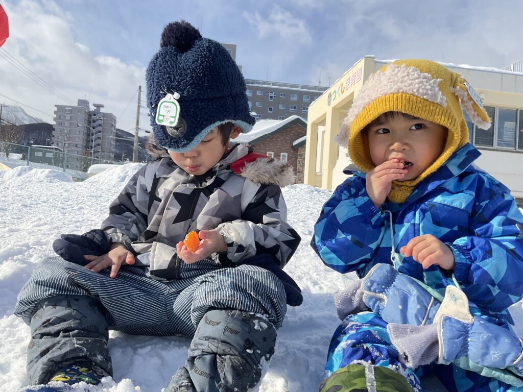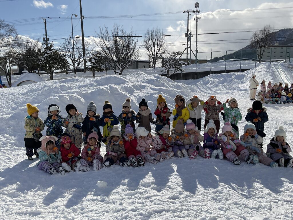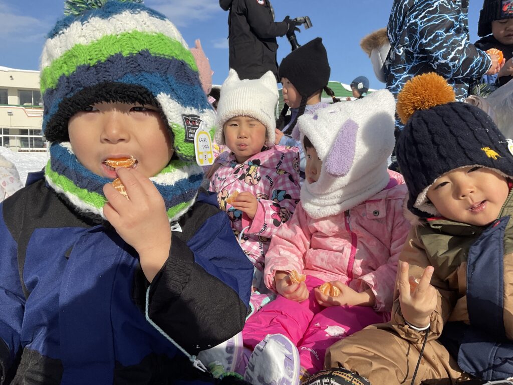 最後はお外でみかんを堪能して「冷たくておいしい!」「負けちゃったけどいっぱいみかん食べれたから嬉しい!」といつもと違う特別感をお友達と楽しんでいて先生達も嬉しかったです⭐