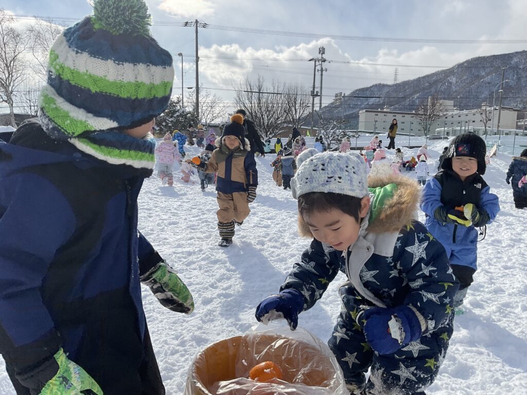 雪山を舞台に、クラス対抗のみかん拾い大会を開催しました!