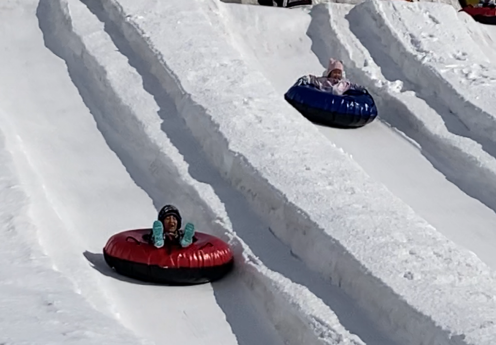 人気のチューブ滑りは45分待ちの長蛇の列でしたが、20分程しか待たず並んでいる間に滑り方の研究をし、順番が来ると大きなチューブを持ち乗り場まで登って行きました。