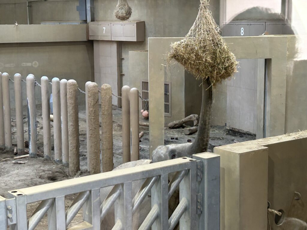 次にゾウを見にいくと、鼻を伸ばして高い所にある草を食べている様子を見ることができました。その様子を見て子どもたちは腕を伸ばして「パオーン!」と真似っこをしていましたよ。